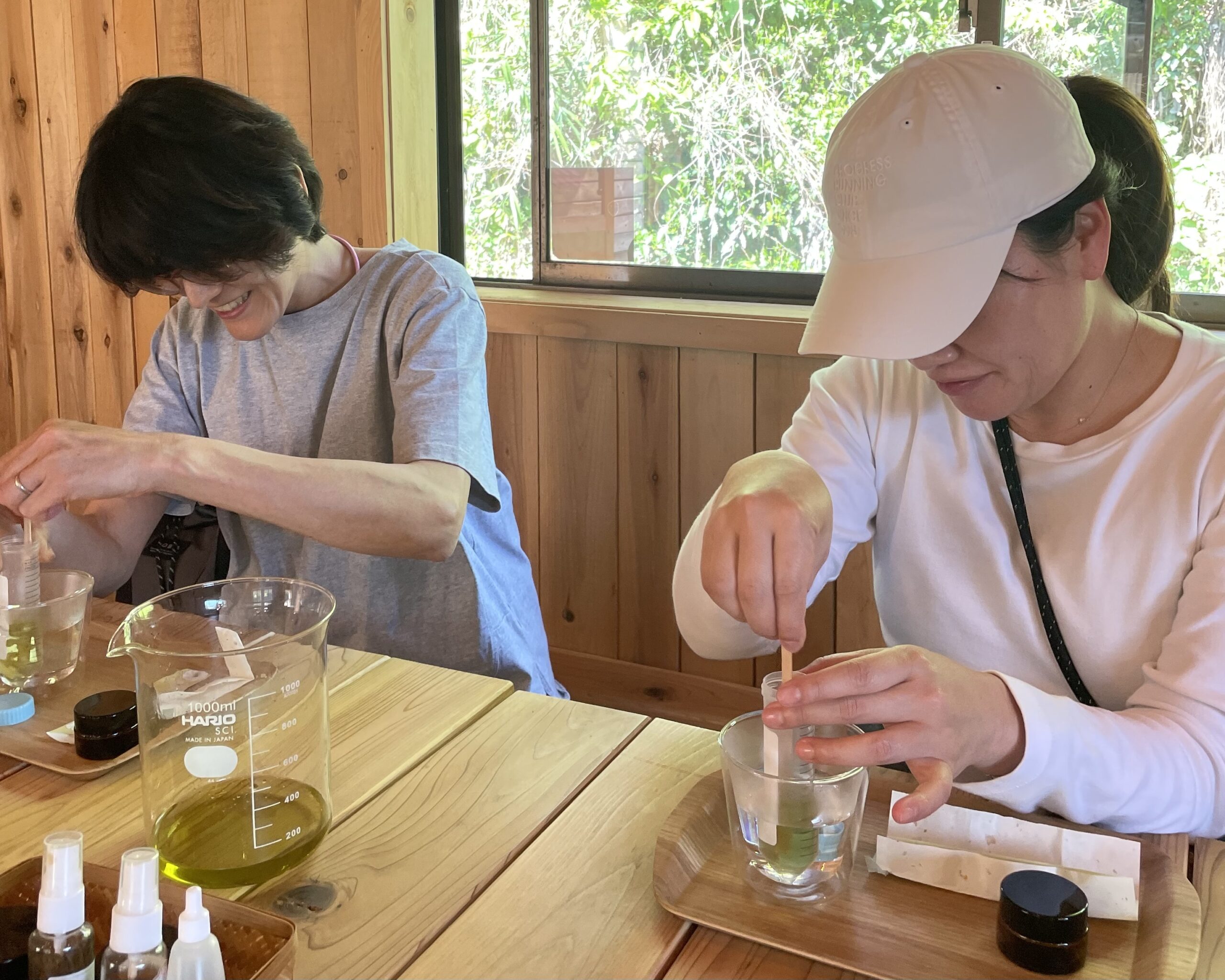 森には興味があるけれどなかなか足が向かない人にも、森のことを知ってもらいたい!という思いから、東京の街の中でも、森の香りWSを開催している。芳香蒸留水やバームを作ることで、自分たちの暮らしが水源地の森と繋がっていることを、香りを通して感じ、学ぶ時間となっている。