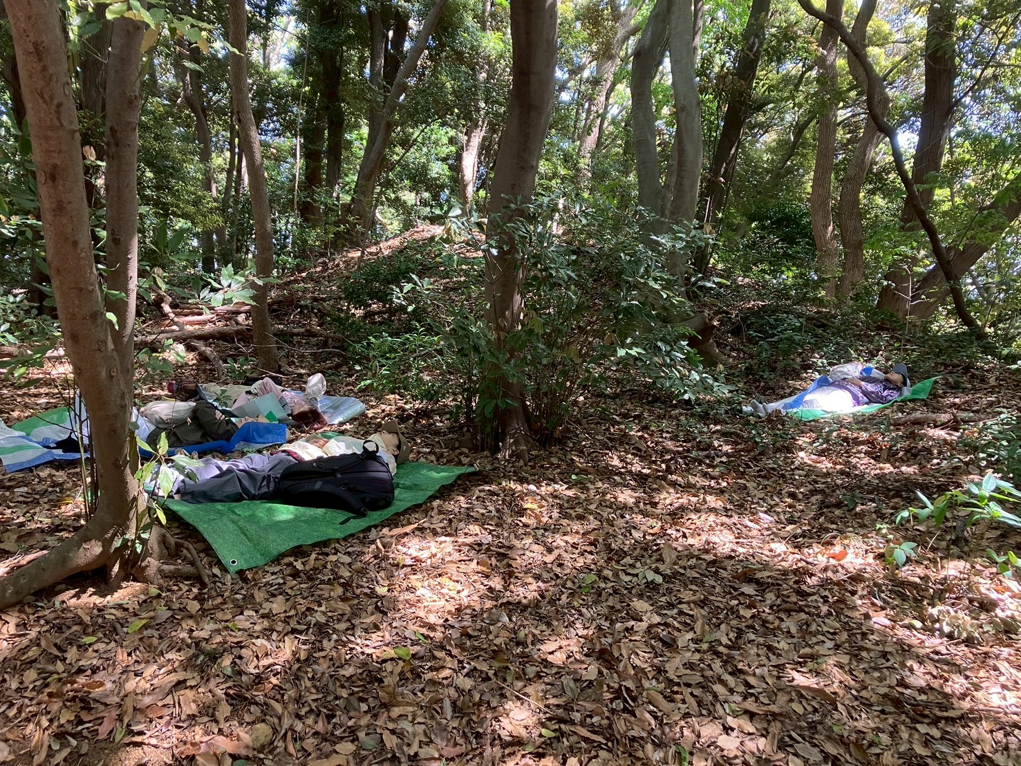 鴻巣山の木漏れ日あふれる中、森ぼっこで静かに自分と向き合うひととき。